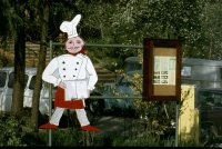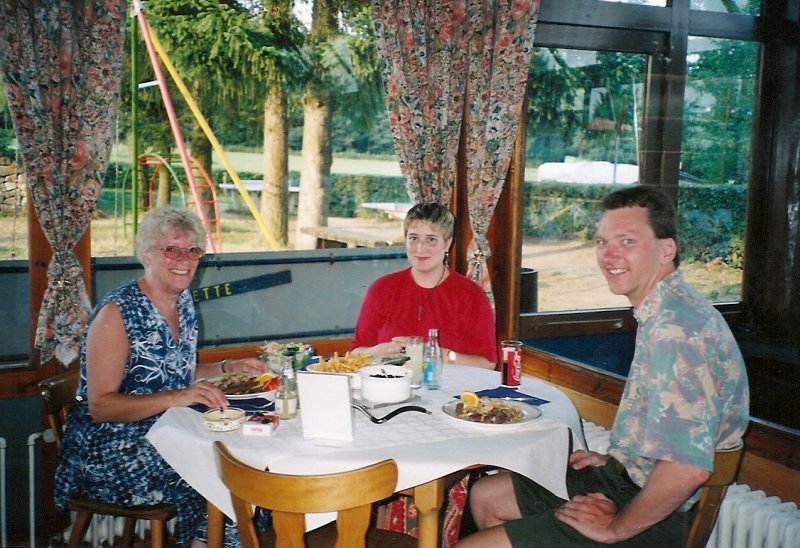Es sieht aus wie ein echter Schnitzel, nur es so zäh, dass es mit dem Messer nicht durchzuschneiden ist. Mehrere Campinggäste (natürlich schon länger bekannte), konnten ein solches Schnitzel "genießen". Zum Beispiel Henk Spek, wir standen alle hinter den Schwingtüren der Küche und sahen zu, wie es enden würde. Erster Schneideversuch, Blick auf das Messer, erneuter Versuch, ein paar Pommes essen, erneuter Versuch, Blick auf andere, die schmackhaft essen, erneuter Versuch, und so weiter. Und wir lachten.