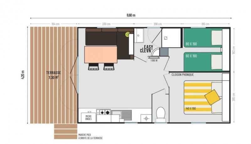 Ingericht voor maximaal 2 volwassenen en 3 kinderen; alles is er aanwezig, behalve het linnengoed, dit dient te worden meegebracht (voor éénpersoonsdekbedden; 1 tweepersoons bed en 3 éénpersoonsbedden voor kinderen waarvan 1 schuin boven de andere). Het is voorzien van warm en koud stromend water, badkamer met douche, aparte w.c., keuken, magnetron, verwarming, KTV en terras.